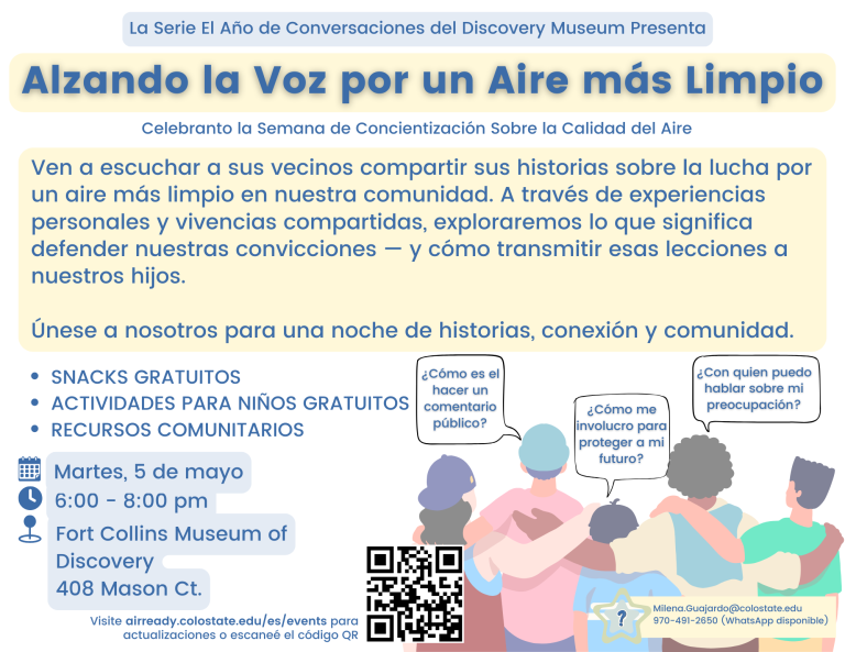 Si le gustaría aprender más o participar en talleres de Aire en Vivo y otros eventos comunitarios relacionados a nuestro proyecto, póngase en contacto con la coordinadora de proyecto enviado un correo electrónico a milena.guajardo@colostate.edu.