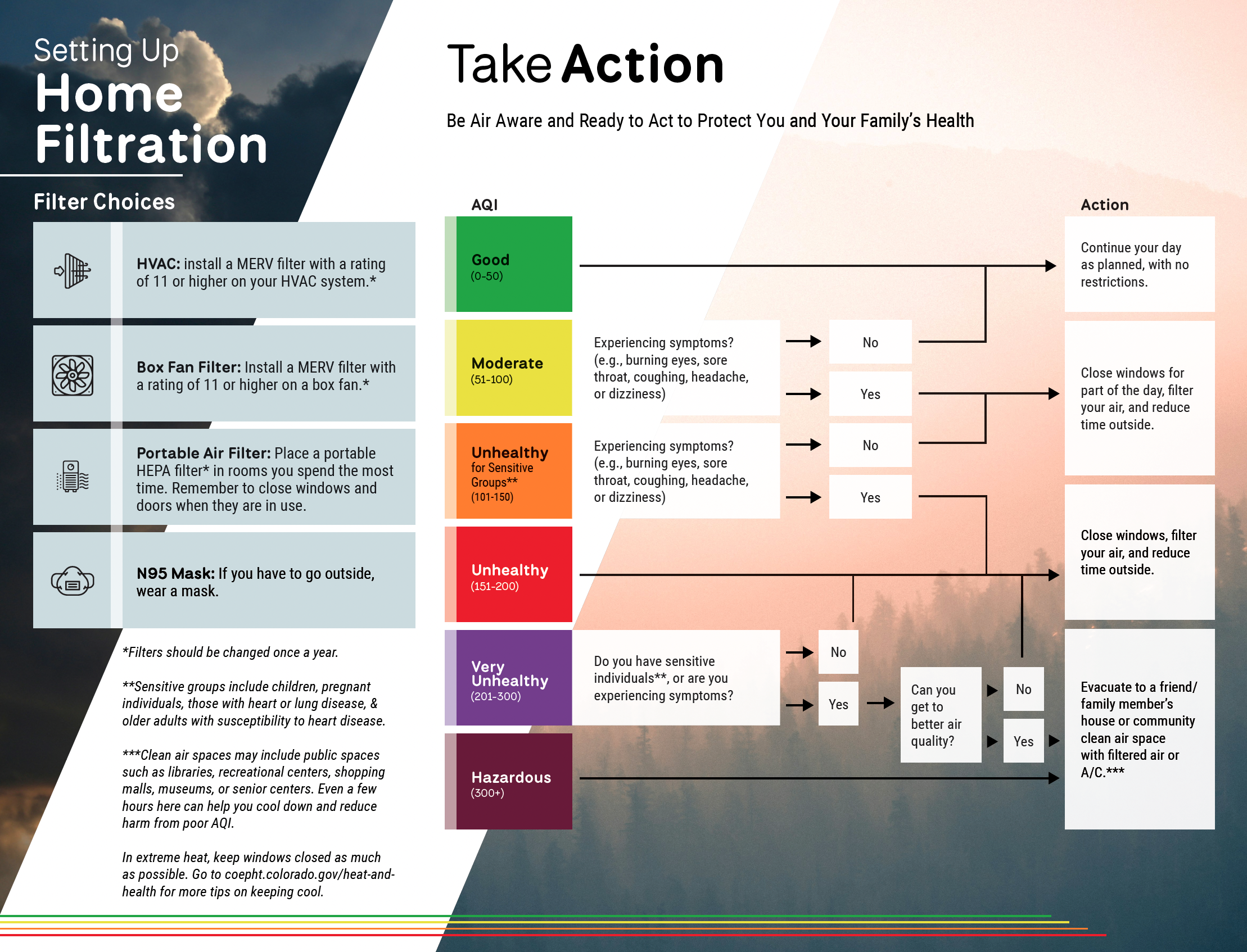 Resources Air Ready Resources Empowering you to check your local air quality and protect yourself and loved ones Check Local Air Quality More Information & Resources Check your Current Air Quality What is the Air Quality Index (AQI)? Subscribe to Air Quality Alerts Be Smoke Ready Bilingual Resource Guide Build a Low Cost Indoor Air Filter How to Install a Swamp Cooler Filter Air Filters Why is Coco Red? (Kid's Booklet) Air Quality for Kids Kids & Air Quality FAQs Wildfire Smoke & Health FAQs Criteria Air Pollutants & Your Health FAQs Air Toxics & Your Health FAQs Ground Level Ozone FAQs For EVEN MORE air quality information, visit CDPHE's Air Pollution Control Division (APCD) resource library